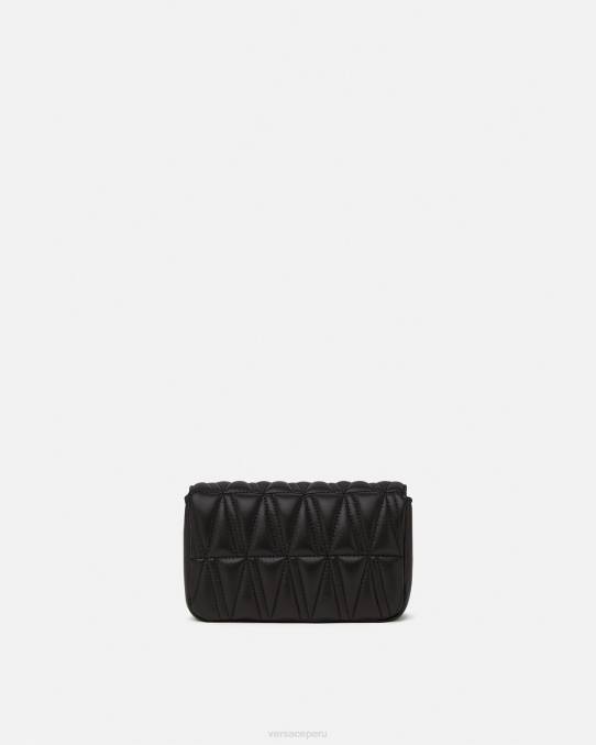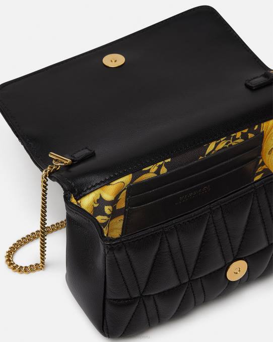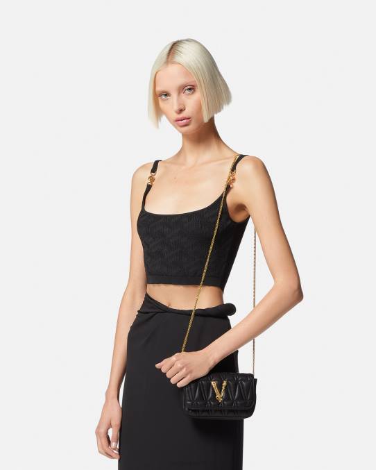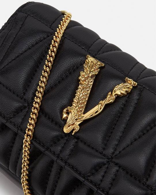 Confeccionado en cuero italiano acolchado con un patrón en V, el mini bolso Virtus presenta herrajes en V barroco con cierre de solapa magnético, completo con una correa de cadena para el hombro, ranuras internas planas para tarjetas y forro con estampado barroco.