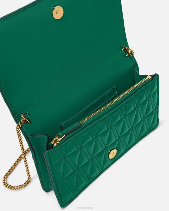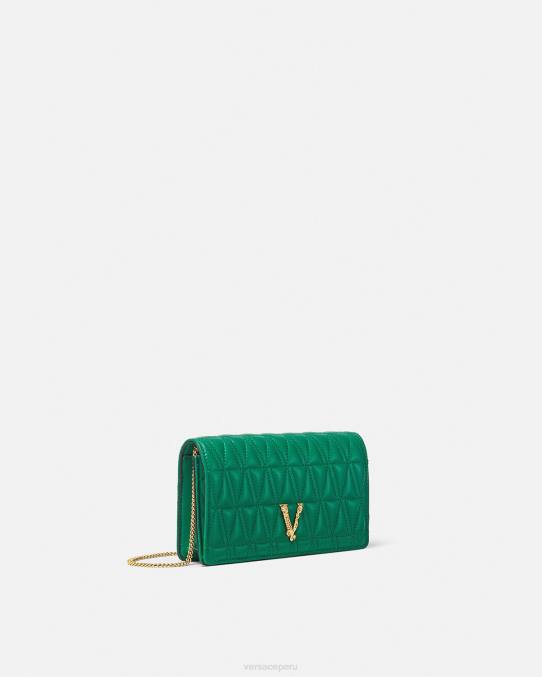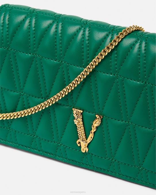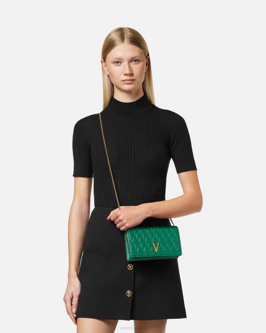 Confeccionado en cuero con un patrón de V acolchado, el bolso de mano Virtus presenta una V barroca con detalles de hojas de acanto grabadas y cierre de solapa magnético. El pequeño bolso de noche se puede llevar en la mano o colgar de una cadena fina y desmontable.