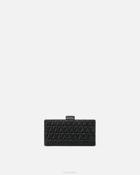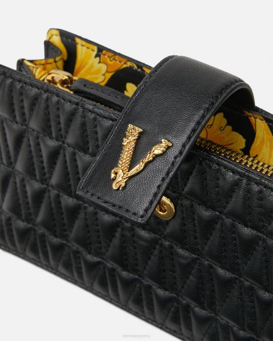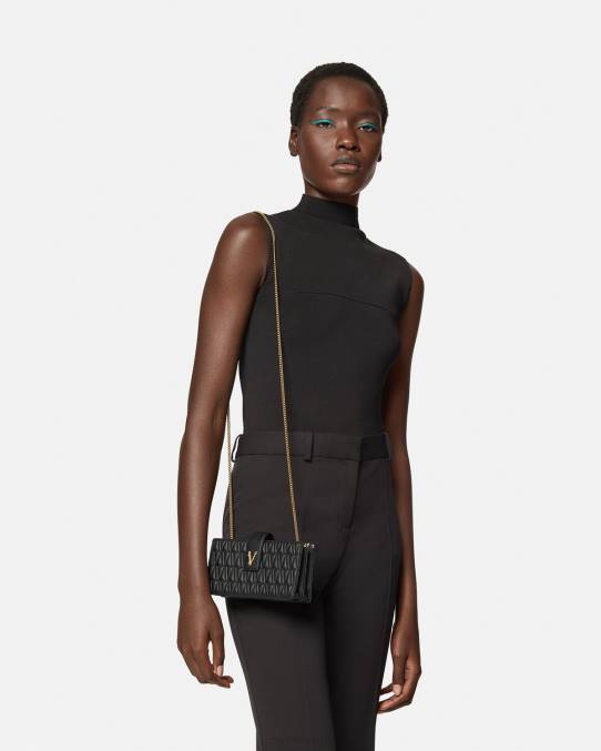 Este bolso de mano, un elegante modelo de noche, está confeccionado en piel flexible acolchada con un diseño en V. El modelo está adornado con relucientes herrajes en forma de V barroco, un emblema de la línea virtus y un forro con estampado barroco.