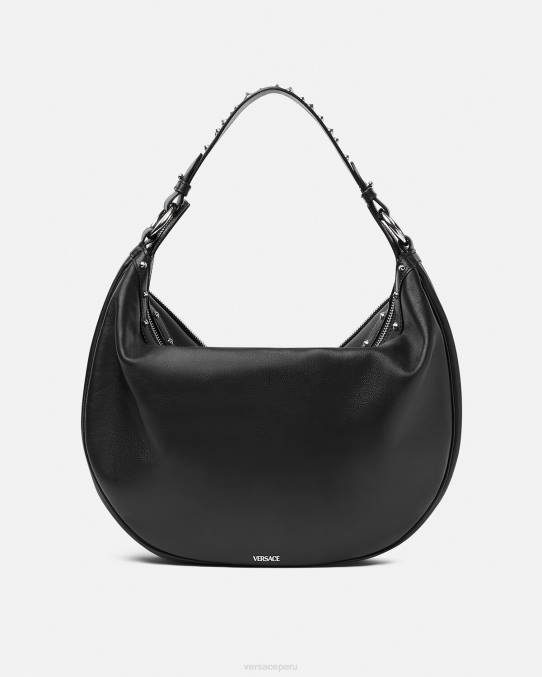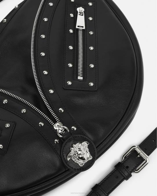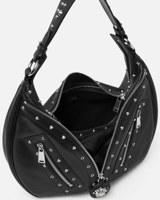 El bolso de hombro repetido, una reedición de una silueta hobo de archivo, está confeccionado en cuero italiano flexible con una correa para el hombro desmontable. De inspiración motera, un tirador con dije de medusa y cremalleras diagonales añaden una actitud grunge con un toque versace.