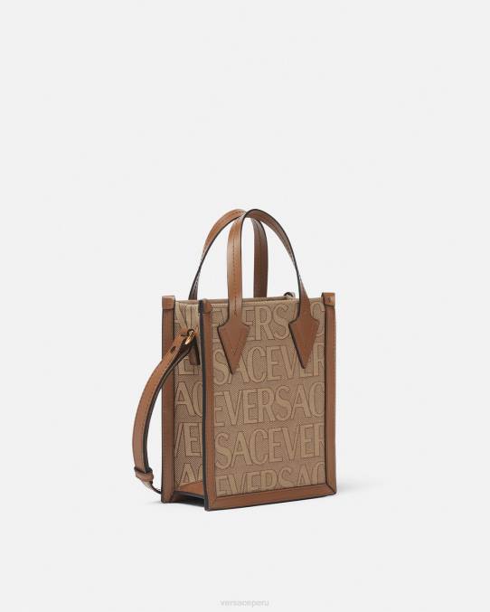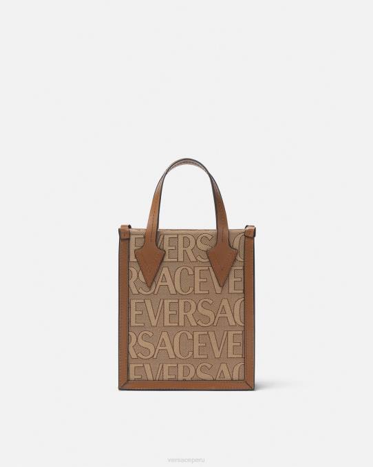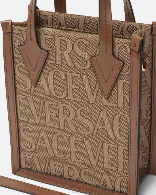 un pequeño bolso bandolera confeccionado en lona jacquard con el estampado integral de versace y ribetes de piel. El estilo abierto está rematado con asas de cuero y una correa para el hombro ajustable y extraíble.