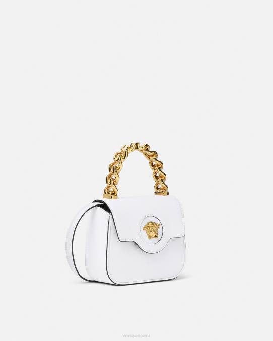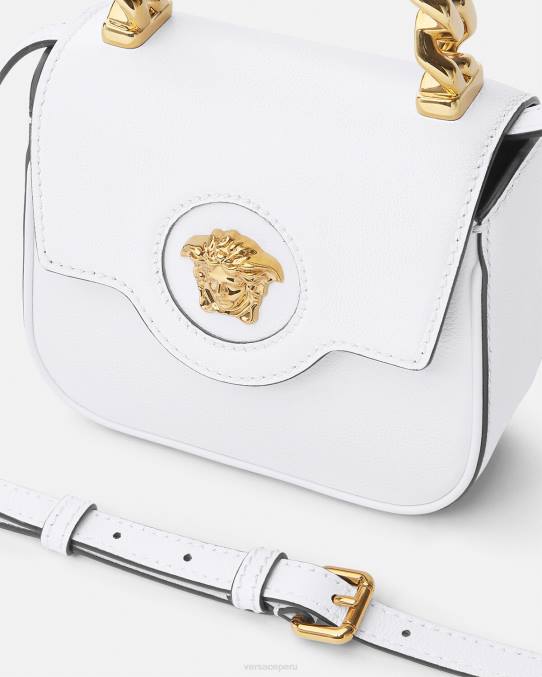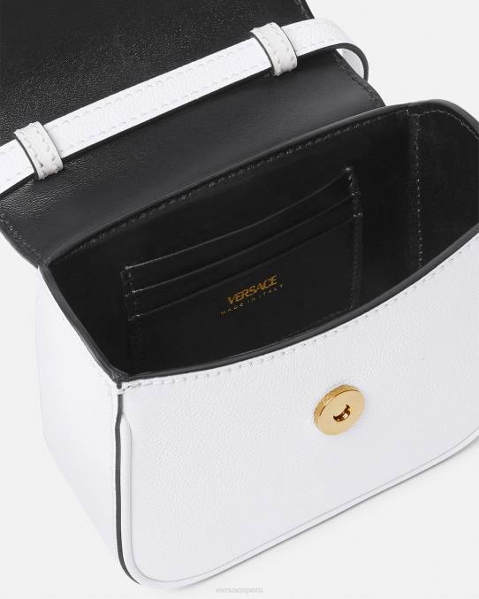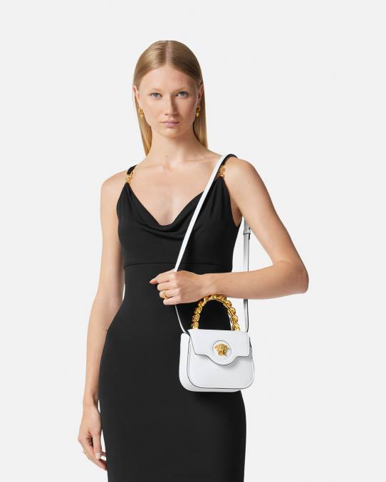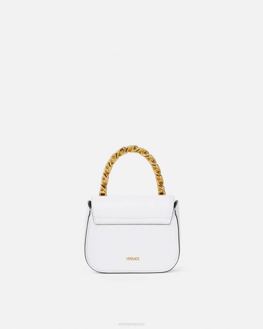 El mini bolso la medusa ha sido elaborado en Italia con cuero granulado. la medusa central se reconoce al instante y el asa superior de cadena fija añade una opción de transporte alternativa junto con la correa para el hombro ajustable y desmontable.