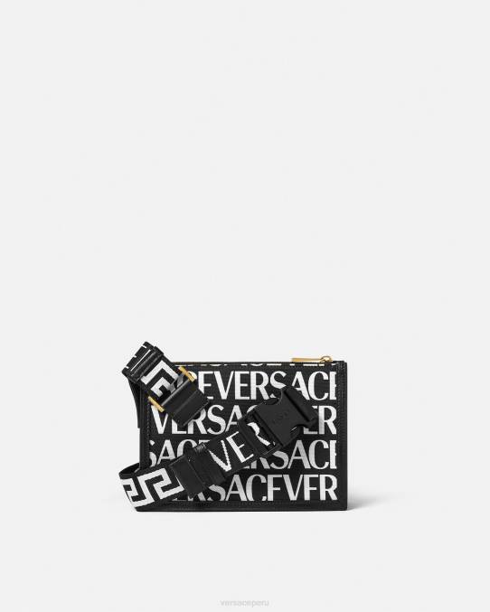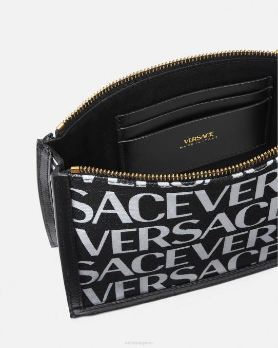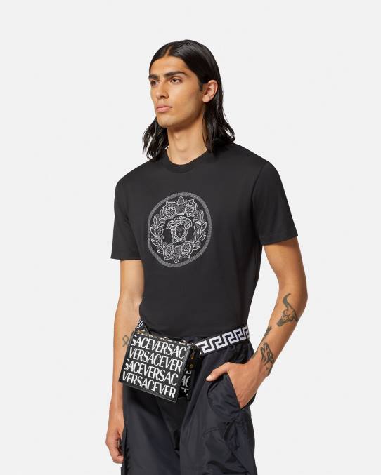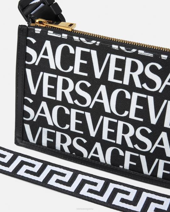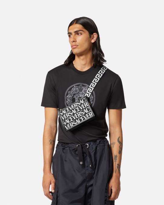 una riñonera compacta confeccionada en lona con el logo de versace estampado por toda la prenda. Este modelo versátil se puede llevar cruzado gracias a la correa ajustable de greca en jacquard y se completa con tres ranuras interiores para tarjetas.