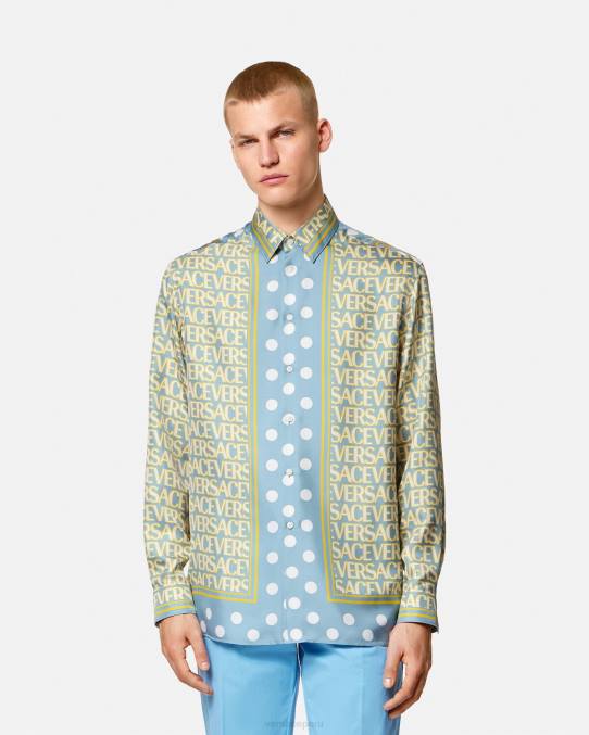 una camisa de sarga de seda de manga larga con botones que presenta el estampado de lunares de Versace en la parte delantera y un panel con estampado de lunares barrocos de concha marina en la parte posterior.