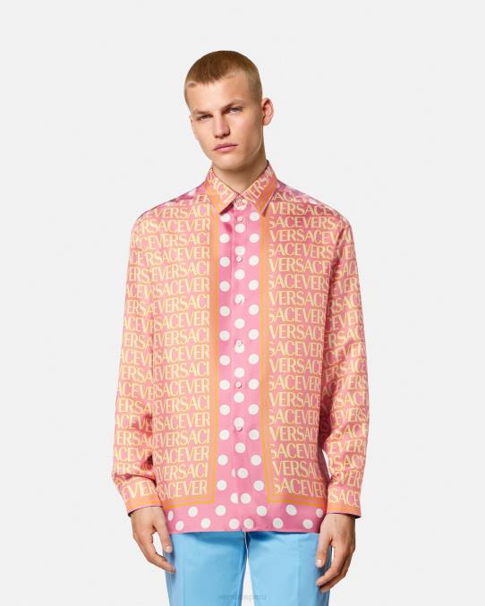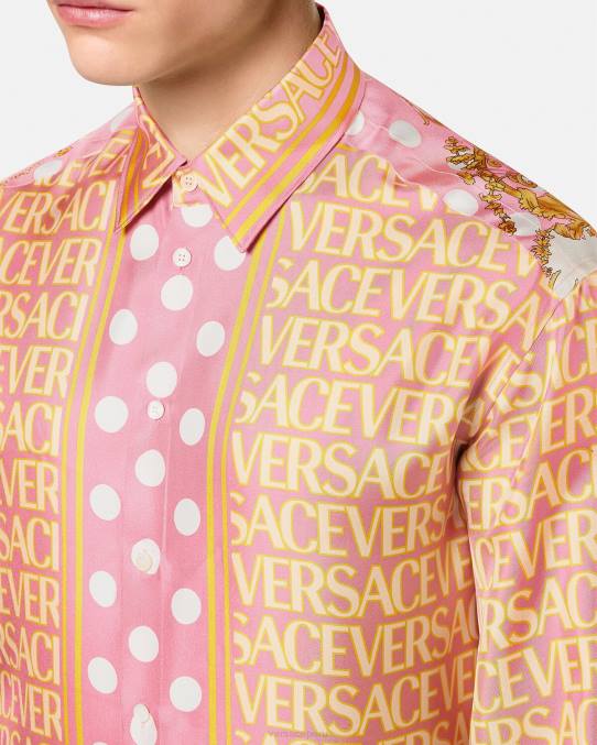 una camisa de sarga de seda de manga larga con botones que presenta el estampado de lunares de Versace en la parte delantera y un panel con estampado de lunares barrocos de concha marina en la parte posterior.