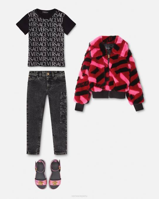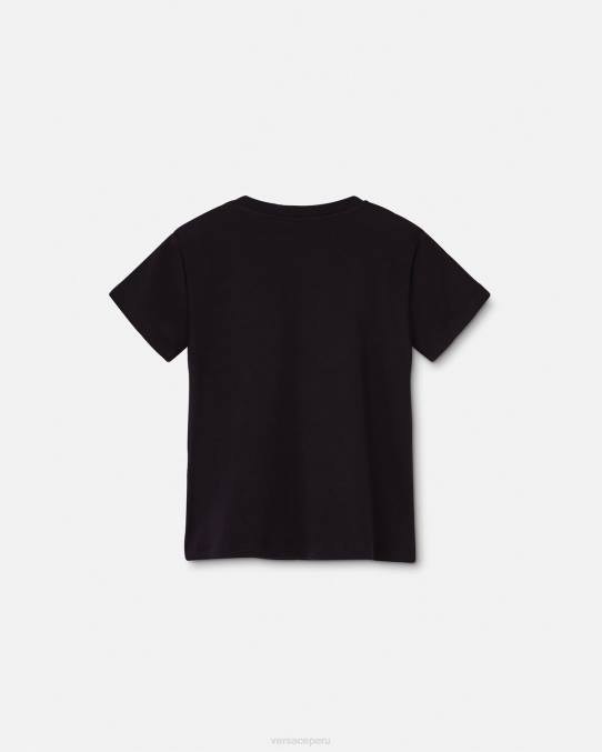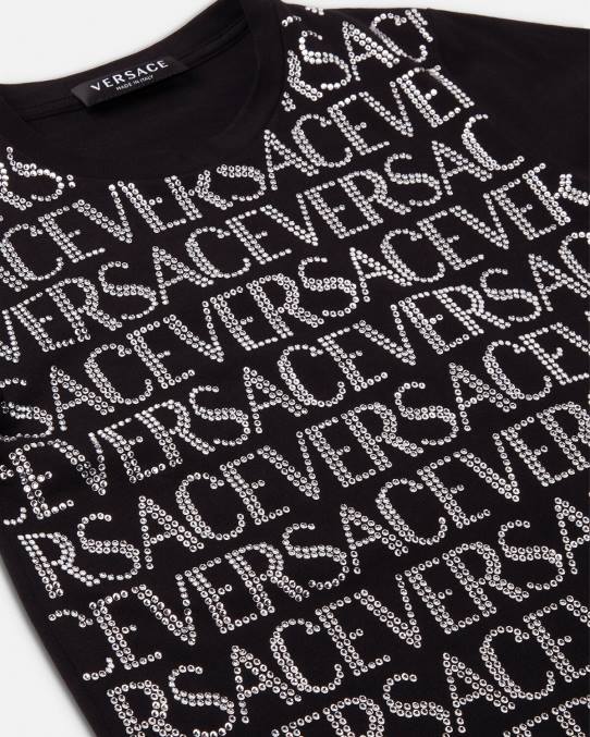 Confeccionada en algodón elástico, esta camiseta de manga corta presenta un estampado del logo infantil de Versace en toda la prenda enriquecido con adornos de cristal.