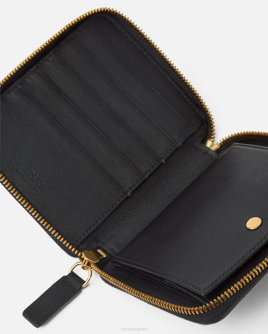 Confeccionada en piel de becerro flexible, esta cartera con cierre de cremallera alrededor presenta detalles metálicos de Medusa en tono dorado.