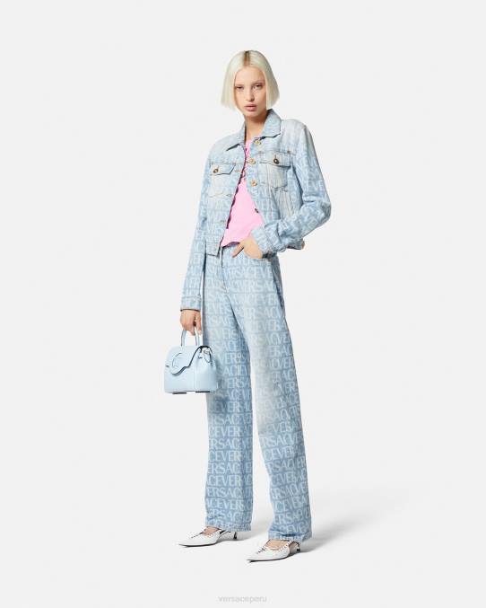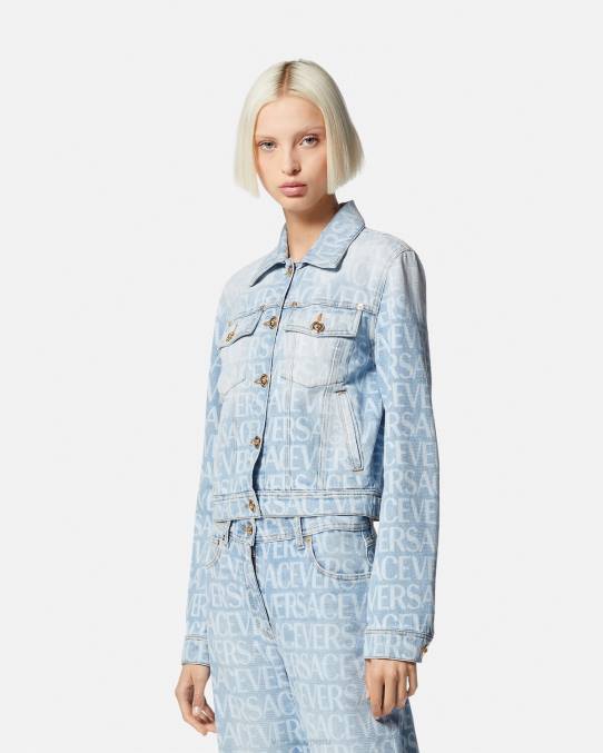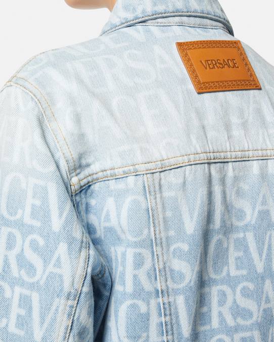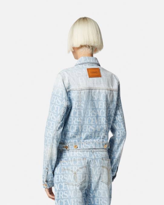 Confeccionada en denim con un acabado ligeramente lavado, esta chaqueta ligeramente corta presenta un estampado integral del logo de Versace grabado a láser con botones de Medusa acentuados y un parche de cuero con el logo en la parte posterior.