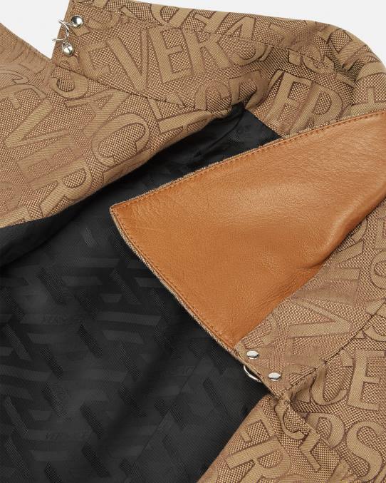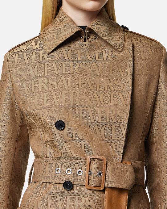una gabardina de lona de Versace con estampado integral de jacquard que presenta un cinturón y cuello reversibles ribeteados en cuero y un cierre cruzado.
