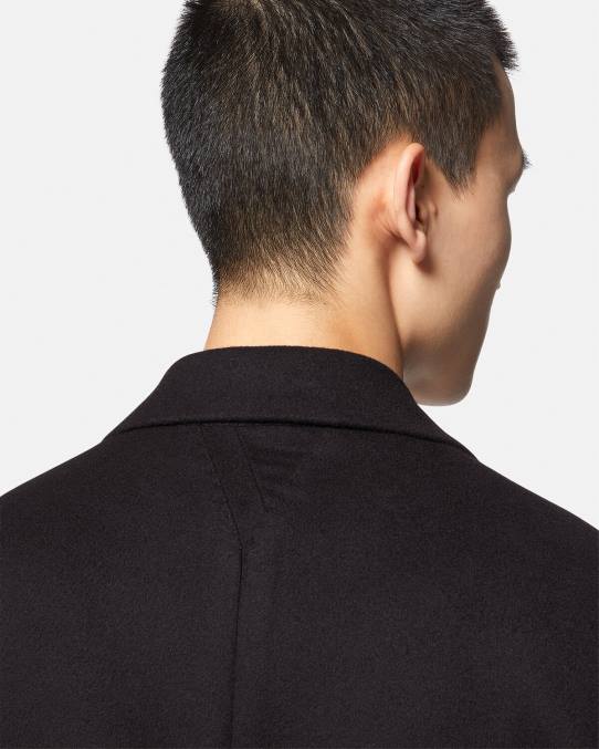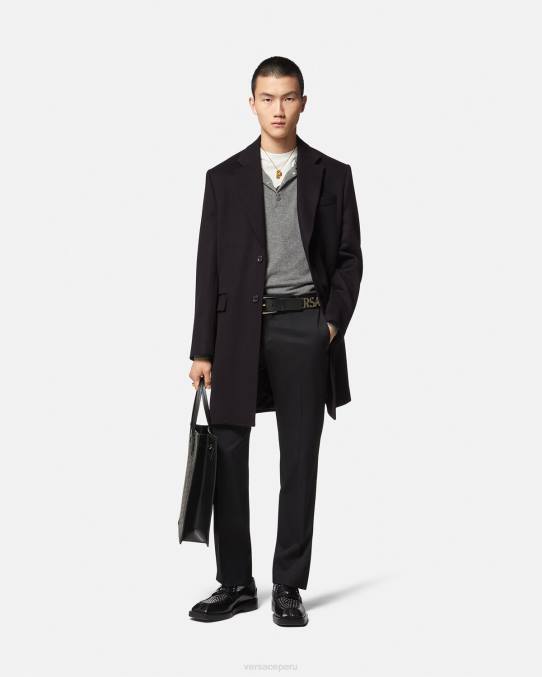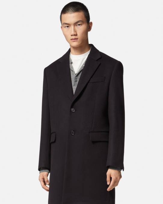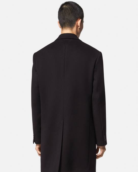 Este abrigo largo, de corte entallado y de botonadura sencilla, está confeccionado en lana y presenta una solapa de muesca y un forro con estampado de La Greca.