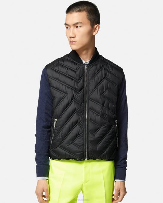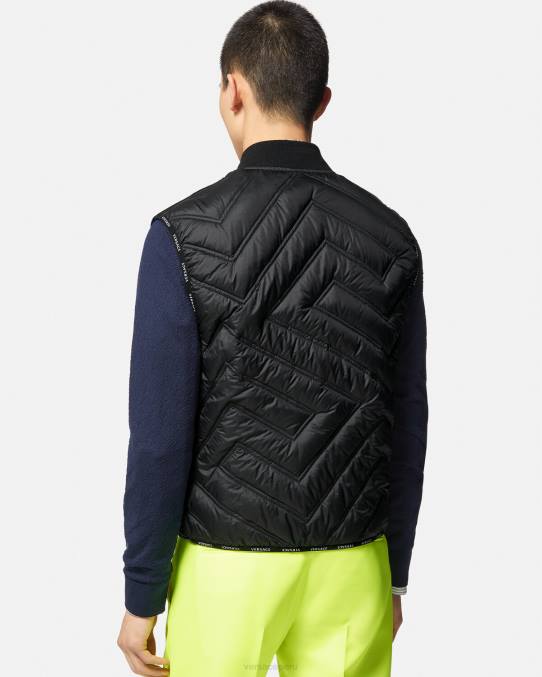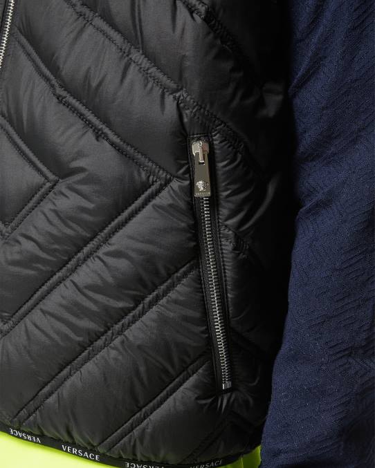Este chaleco acolchado, de diseño liviano, presenta una capa acolchada de La Greca con ribetes con logo. Este estilo sin mangas está acentuado por cremalleras metálicas de Medusa y revela un forro vibrante.