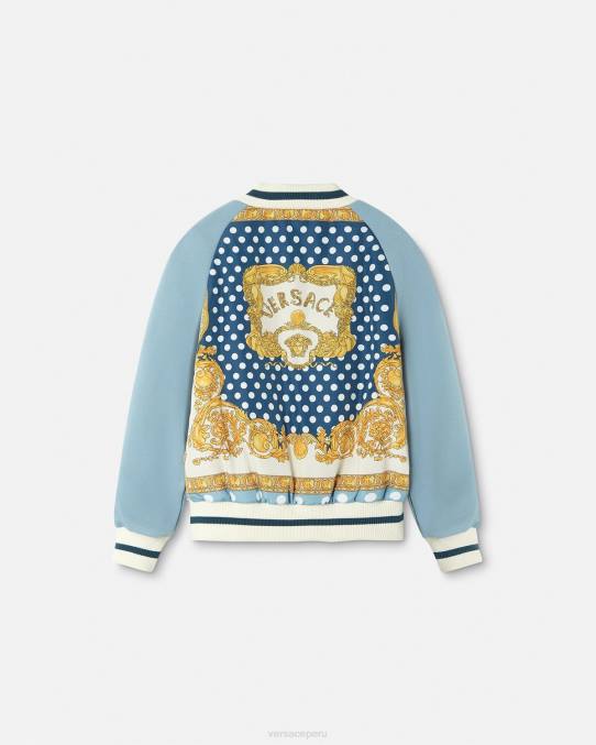 una chaqueta acolchada con paneles que presenta un estampado infantil de lunares de Versace de nailon en la parte delantera, mangas de punto y un estampado infantil de lunares barroco de concha marina en la parte posterior. el estilo de ropa exterior si se termina con ribetes acanalados a rayas.