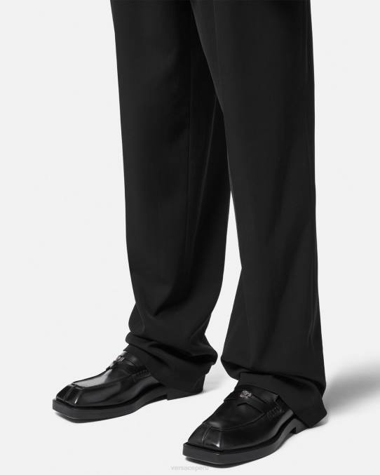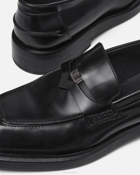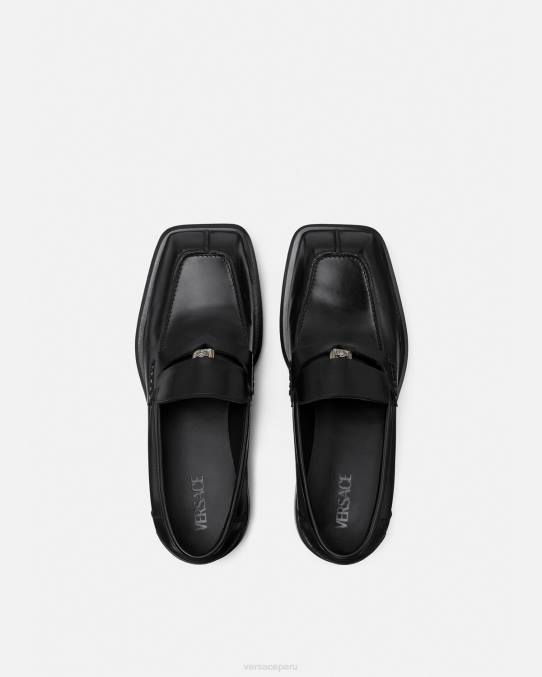 Confeccionados en cuero, estos mocasines cuentan con una puntera cuadrada cincelada y están detallados con un adorno de medusa cuadrado en la correa tipo penny. el par se asienta sobre tacones apilados de cuero.