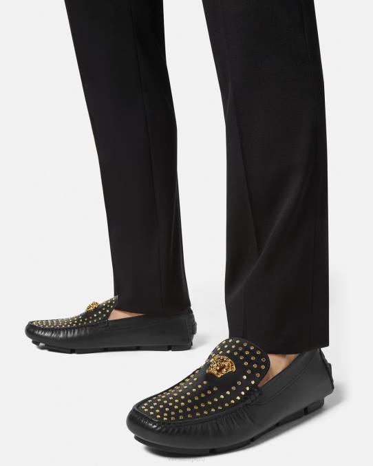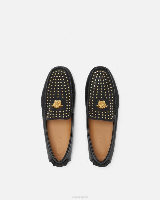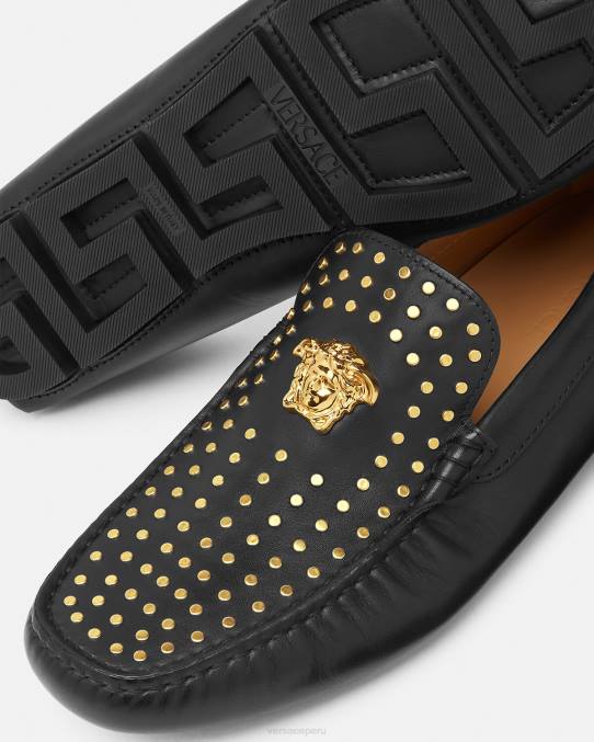 Estos mocasines de cuero, un estilo de zapato de conducción sin cordones, están realzados por un hardware tridimensional de la Medusa en la parte superior y cuentan con un logotipo de goma en el talón. El par tiene una suela de goma con estampado de greca.
