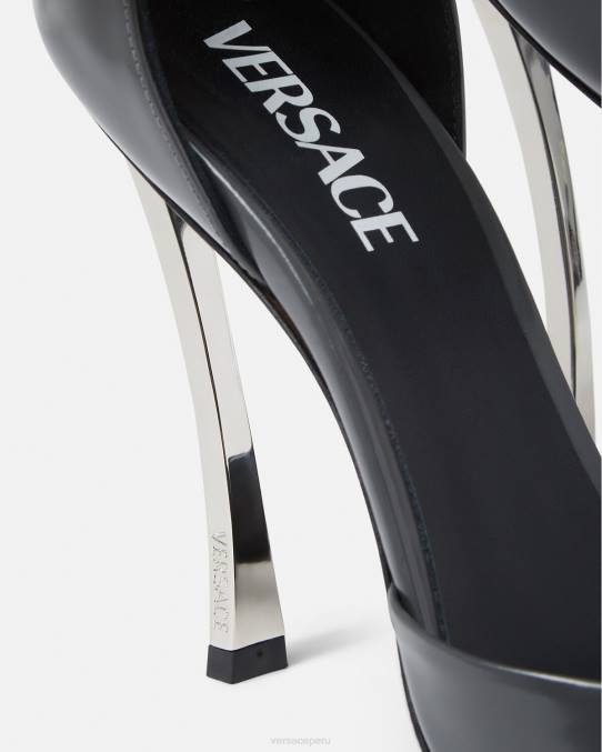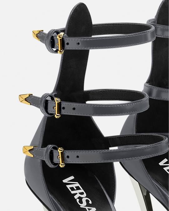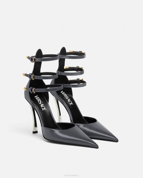 Caracterizados por tacones de aguja altos y curvos, estos zapatos de tacón de cuero cuentan con puntera puntiaguda y correas con doble hebilla en la parte delantera. están acentuados por herrajes en forma de V.
