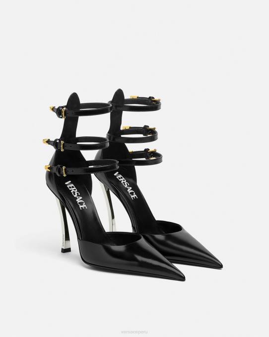 Caracterizados por tacones de aguja altos y curvos, estos zapatos de tacón de cuero cuentan con puntera puntiaguda y correas con doble hebilla en la parte delantera. están acentuados por herrajes en forma de V.