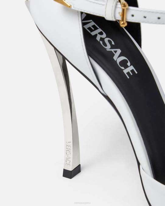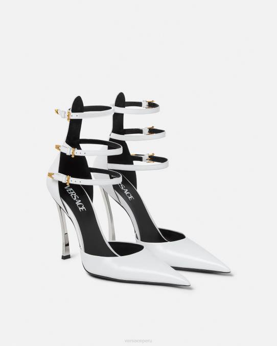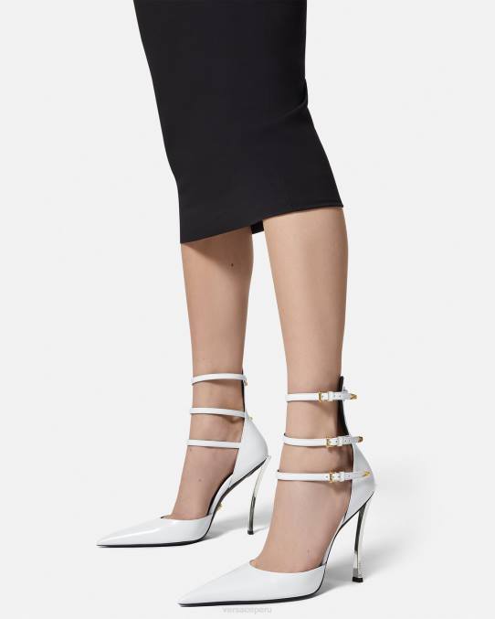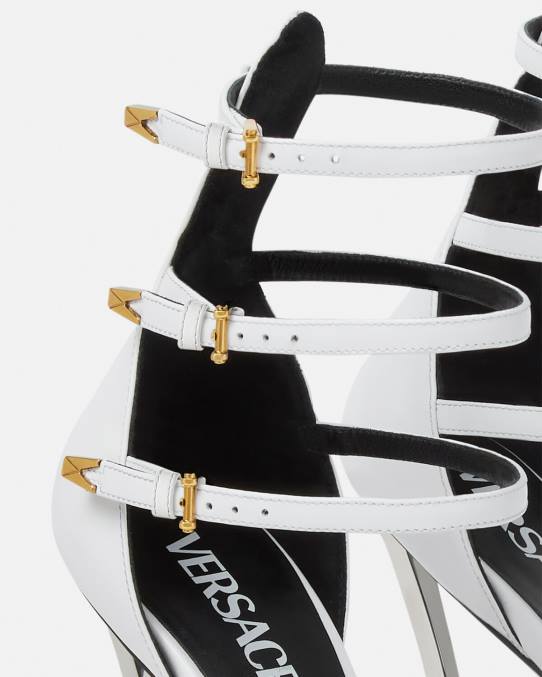Caracterizados por tacones de aguja altos y curvos, estos zapatos de tacón de cuero cuentan con puntera puntiaguda y correas con doble hebilla en la parte delantera. están acentuados por herrajes en forma de V.
