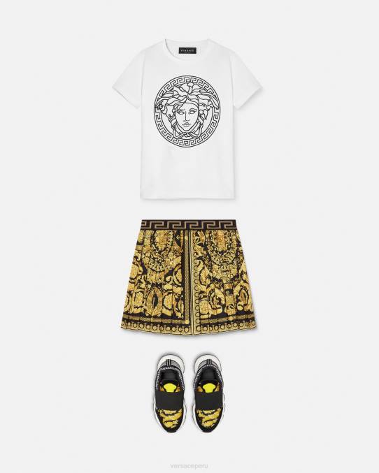 Un diseño icónico de Versace traducido para las más pequeñas, esta minifalda plisada tiene estampado barroco. la falda presenta una cinturilla elástica con greca jacquard para mayor comodidad.