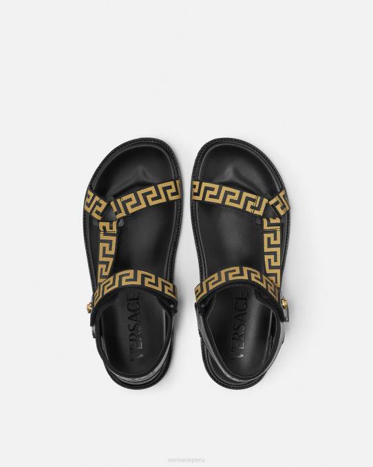 Estas sandalias con punta abierta, asentadas sobre una cómoda plantilla moldeada, cuentan con tiras de jacquard con estampado de greca entrecruzadas. El hardware de Medusa acentúa el par.