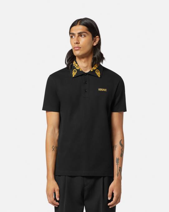 Confeccionado en piqué de algodón, este polo de manga corta presenta una tapeta de tres botones, un logotipo de Versace bordado en el pecho y un bordado barroco de Maschera en el cuello.