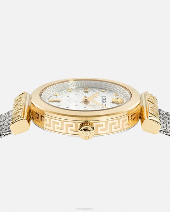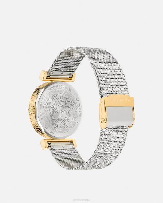 Este refinado reloj se caracteriza por las letras Versace en las asas que enmarcan la esfera. La esfera está enriquecida con una medusa tridimensional a las 12 h y un patrón de greca. El accesorio se completa con una banda de malla metálica. Todos los relojes Versace están garantizados por la marca "fabricación suiza".