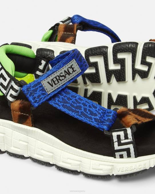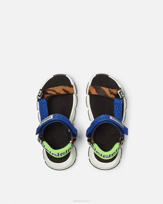 Un diseño colorido reinventado para los más pequeños, estas divertidas sandalias cuentan con tiras con estampado de animales y Greca con el logotipo de Versace y la entresuela de Trigreca.