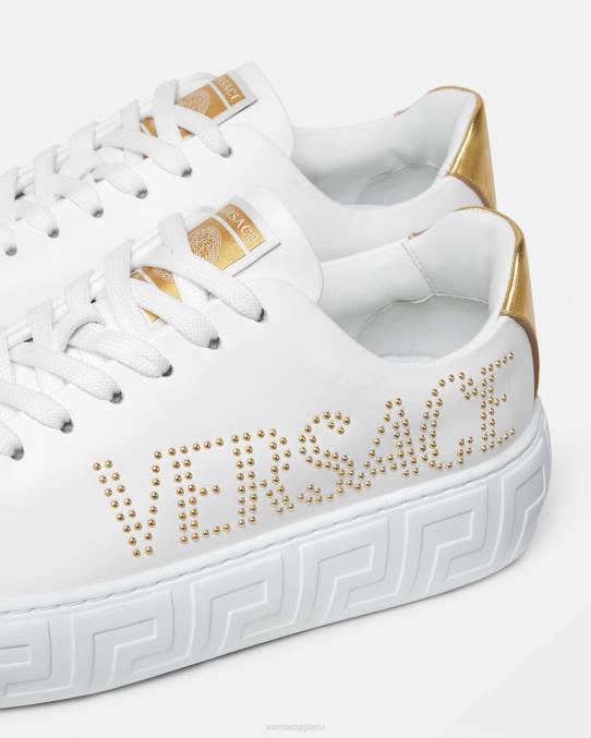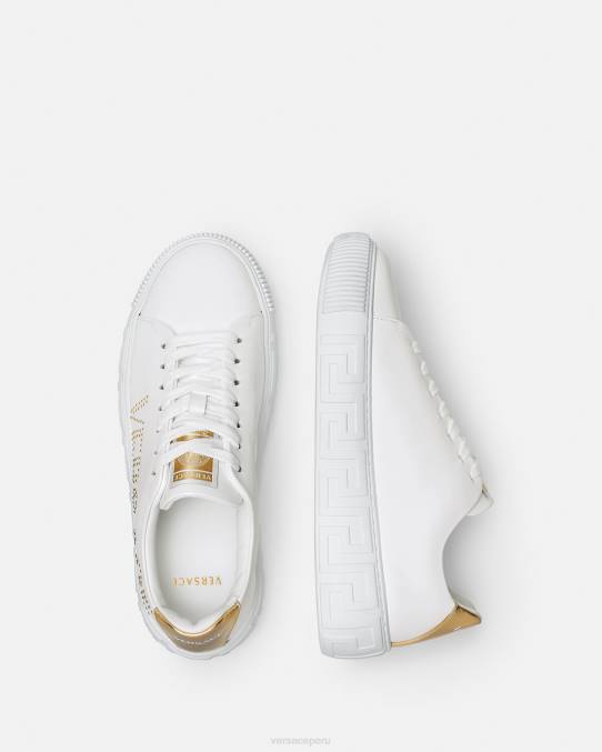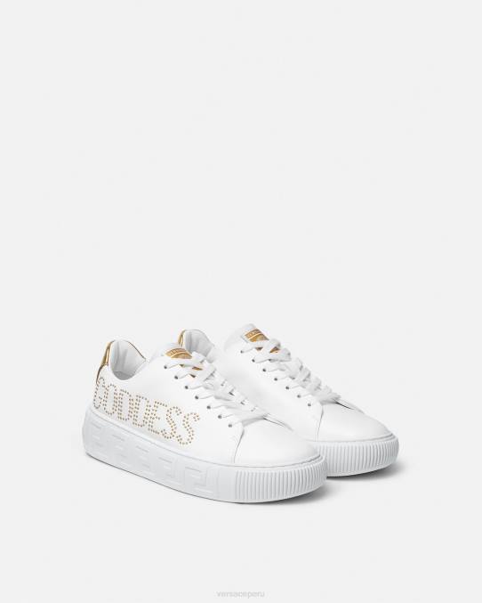 La silueta de caña baja se caracteriza por un patrón de greca grabado sobre suelas de goma vulcanizada, con las palabras "versace" y "diosa" tachonadas en los laterales. un sello con el logotipo en la parte trasera acentúa el estilo con cordones.
