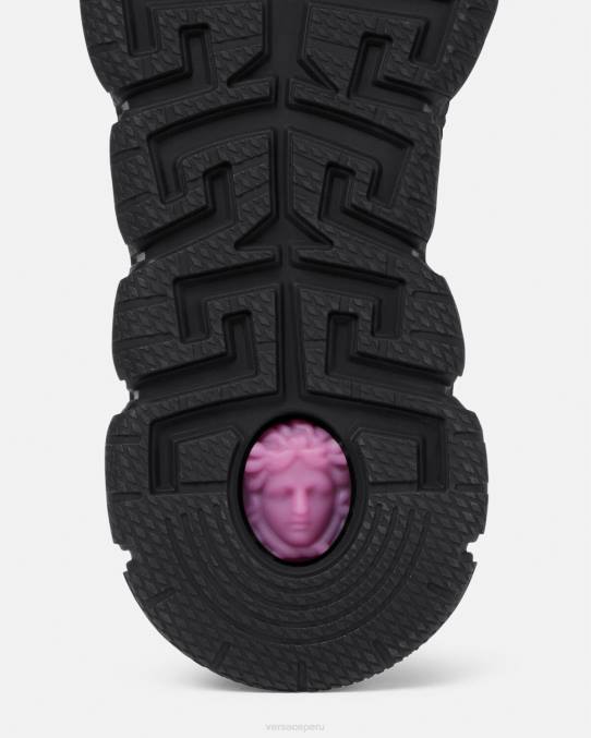 Las zapatillas Trigreca aportan innovación a la estética en constante evolución de la marca. Con un diseño tonal con detalles de tachuelas, las ejecuciones tridimensionales de greca en las suelas ofrecen un aterrizaje impactante con el "sistema de amortiguación greca". En un guiño sutil a la ciudad natal de Versace, la parte superior tiene una discreta impresión de las coordenadas de Milán.