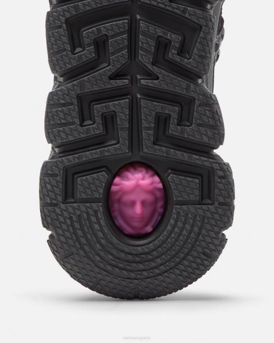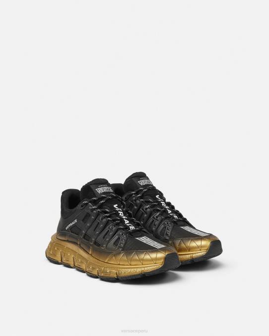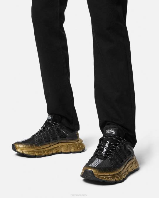 Las zapatillas Trigreca aportan innovación a la estética en constante evolución de la marca. Con un diseño degradado, las ejecuciones tridimensionales de greca en las suelas ofrecen un aterrizaje impactante con el "sistema de amortiguación greca". En un guiño sutil a la ciudad natal de Versace, la parte superior tiene una discreta impresión de las coordenadas de Milán.