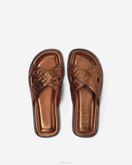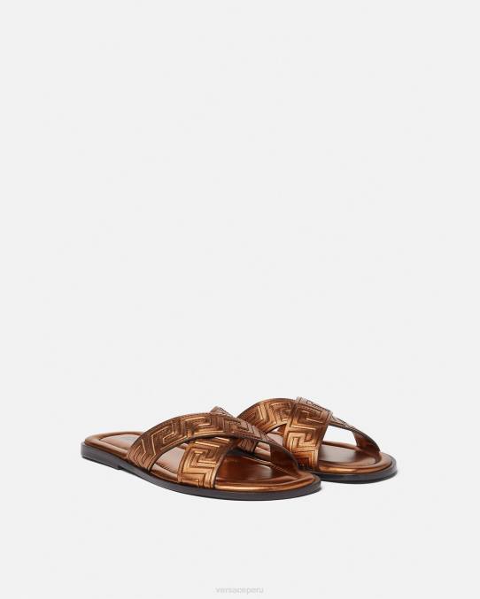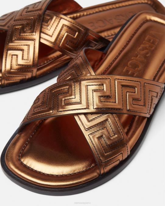 Estas sandalias con punta abierta están confeccionadas en cuero con un patrón de greca cosido en las tiras.