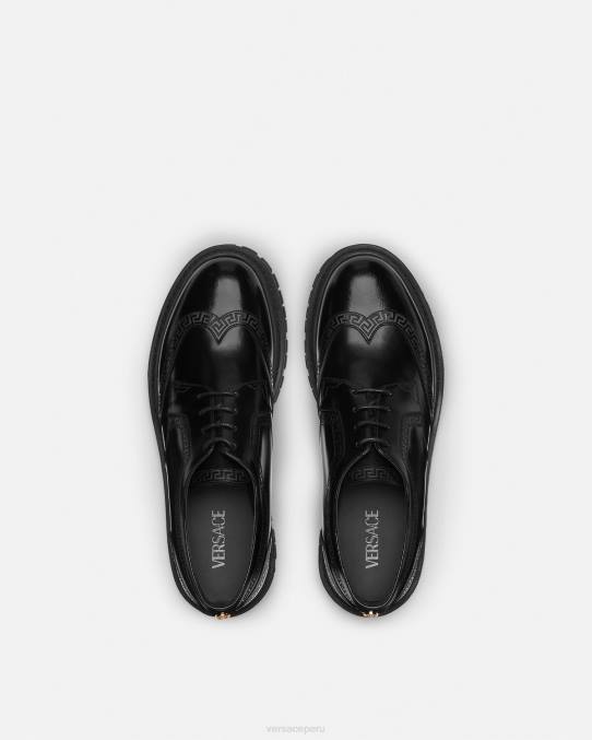 Estos zapatos derby con suelas de goma están confeccionados en cuero pulido con detalles brogue de La Greca y un detalle de tachuelas de Medusa en la parte superior.