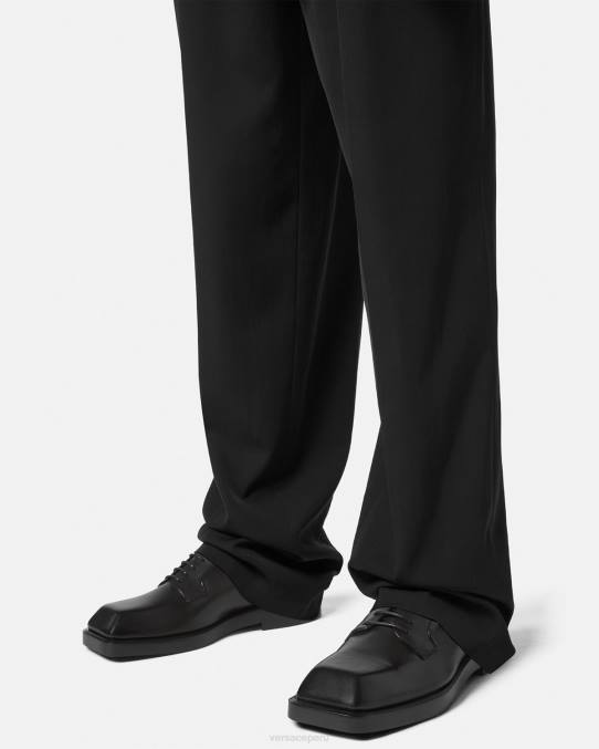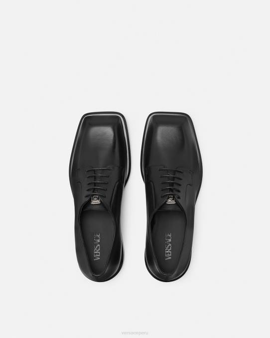 Confeccionados en cuero, estos zapatos derby con cordones cuentan con una puntera cuadrada cincelada y están detallados con un adorno de medusa cuadrado en la lengüeta. Están asentados sobre tacones apilados de cuero.